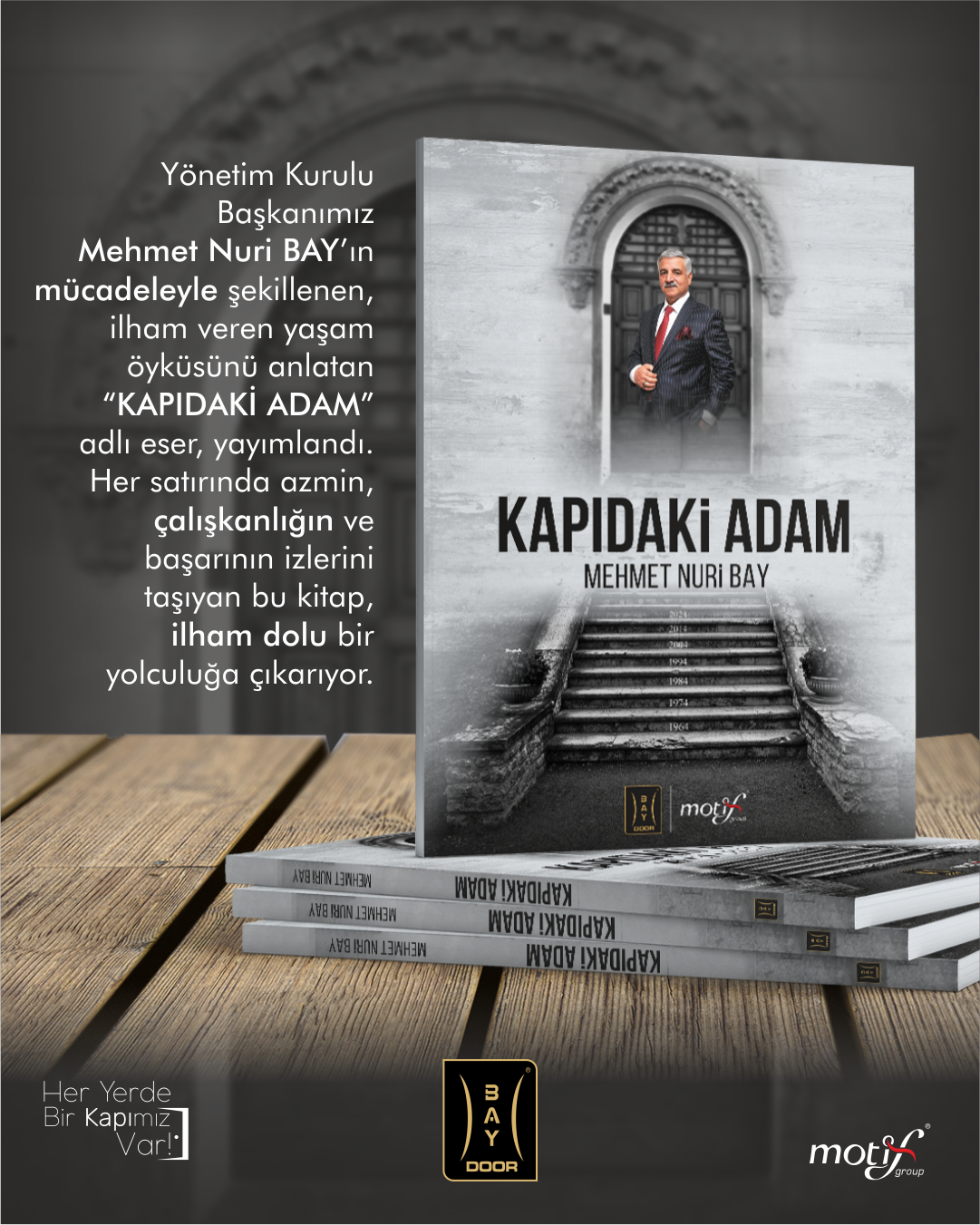 Baydoor Yönetim Kurulu Başkanı Mehmet Nuri BAY’ın azim, çalışma disiplini ve başarı dolu hayat hikâyesini konu alan "Kapıdaki Adam" adlı eser, okuyucularla buluştu. Mücadeleyle şekillenen ve ilham veren bu özel kitap, iş dünyasında ve hayatın her alanında kararlılıkla ilerleyenlerin yolculuğuna ışık tutuyor. Satır aralarında, girişimciliğin, emeğin ve hedefe ulaşma azminin izlerini barındıran "Kapıdaki Adam", Mehmet Nuri BAY’ın zorluklara karşı nasıl yılmadan mücadele ettiğini ve bu süreçte elde ettiği başarıları gözler önüne seriyor. Okuyucular"ına motivasyon ve ilham kaynağı olmayı hedefleyen kitap, sadece bir yaşam öyküsü olmanın ötesinde, aynı zamanda kararlılıkla çalışan herkesin kendi başarı hikâyesini yazabileceğini gösteren bir rehber niteliği taşıyor. Baydoor ailesi olarak, bu anlamlı eserin sektörümüzde ve iş dünyasında fark yaratacağına inanıyor, herkesi bu ilham dolu yolculuğa ortak olmaya davet ediyoruz.